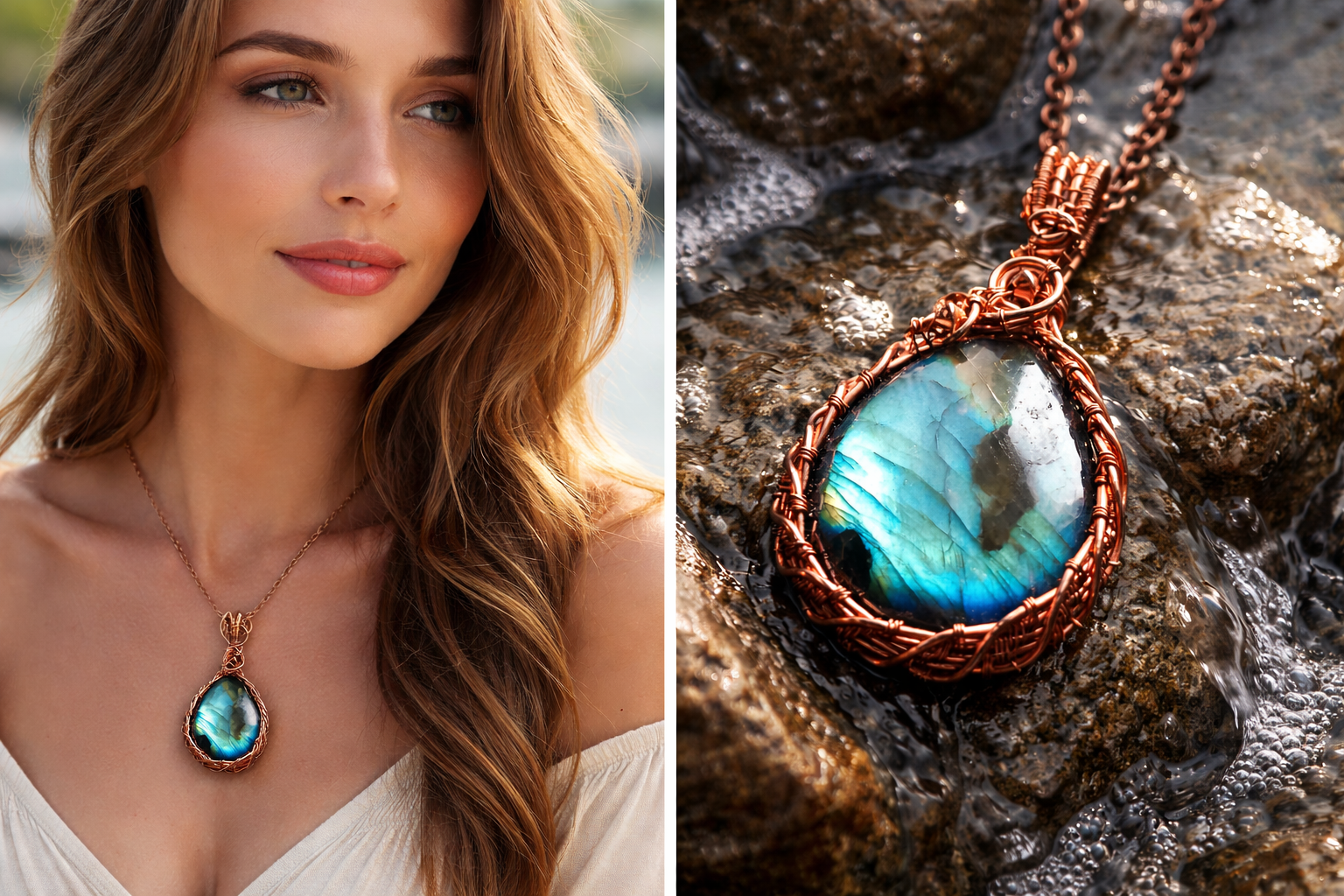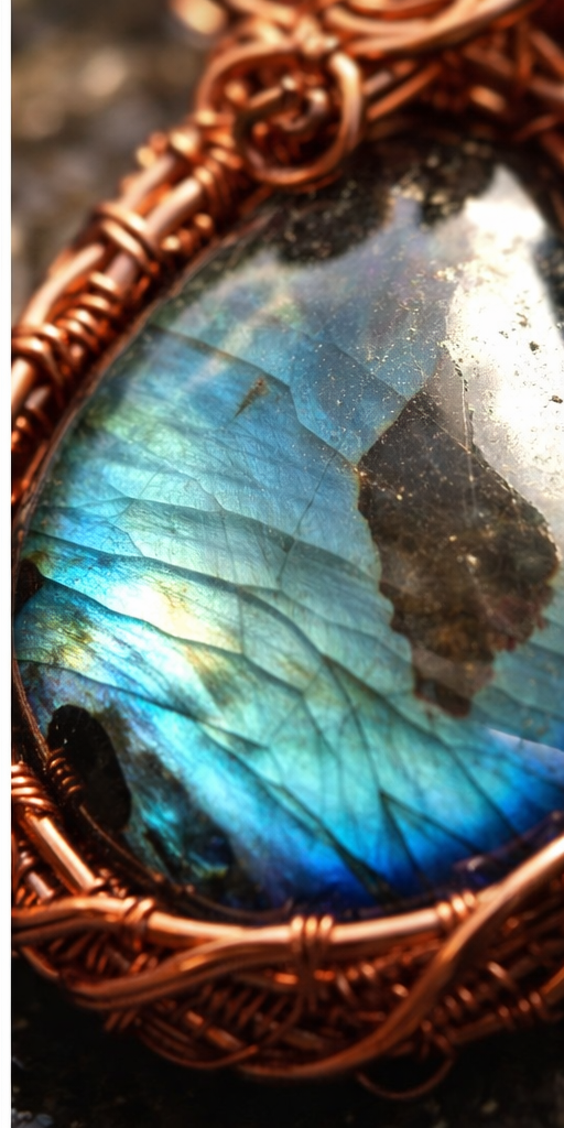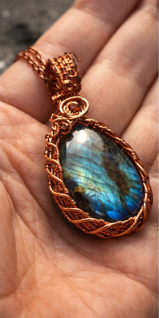 Autorský měděný šperk s labradoritem – surová měď
